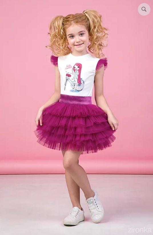 Святковий комплект для дівчинки. Складається з футболки та пишною спіднички. Футболка з округлим коміром і рукавом "крильце" з м'якої однотонної сітки. На поличці - забавний принт, виконаний в єдиній колірній гамі комплекту. Спідниця-пачка з м'якої однотонної сітки. Пояс з атласу, по спинці вшита гумка.