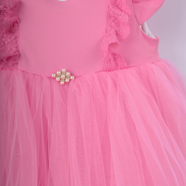 Надзвичайно гарне, ошатне плаття для дівчинки. Відмінно підійде для будь-якого торжества. Приталений Фасон, з пишною спідничкою, короткий рукавчик, прикрашений мереживом. Плаття на грудях також прикрашене мереживом і брошкою. Ззаду є атласний пояс, для регулювання обсягу талії. Модель повністю на бавовняній підкладці. Ззаду застібка - потайная блискавка.